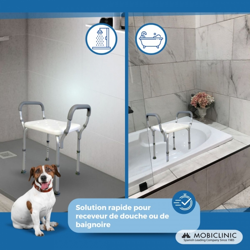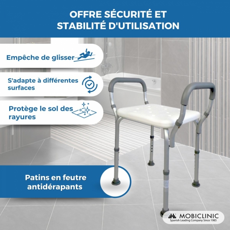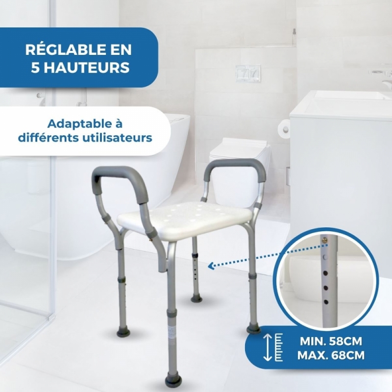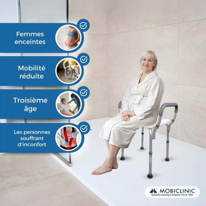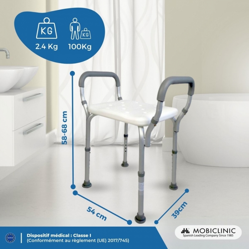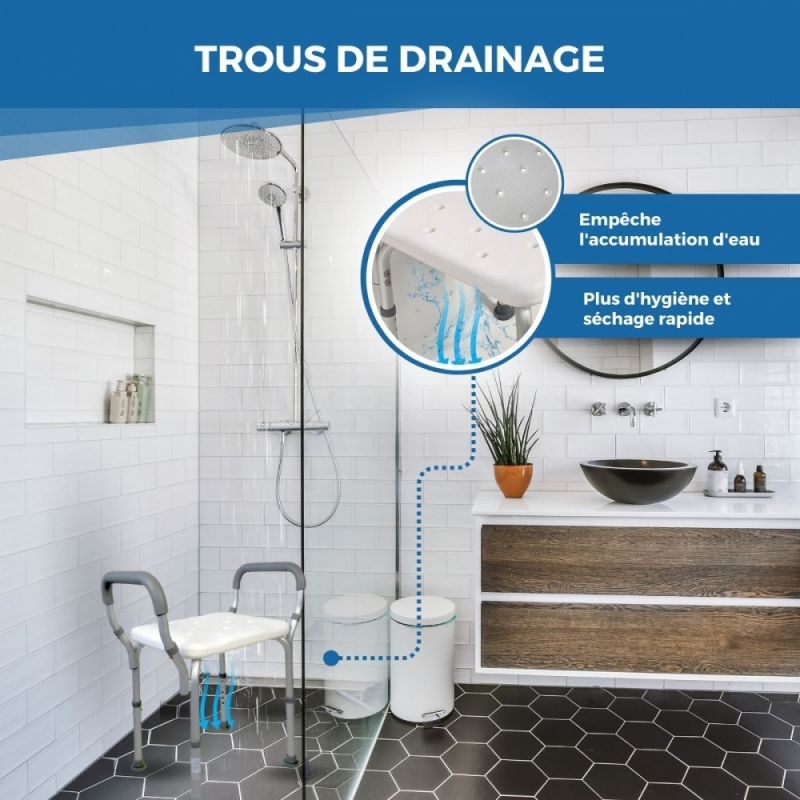 - Son poids : grâce à ses matériaux de fabrication, la chaise de douche orthopédique ne pèse que 2,4 kg, parfaite pour se déplacer confortablement dans les toilettes.