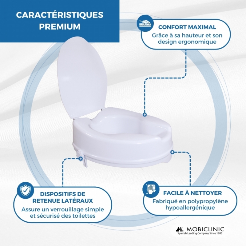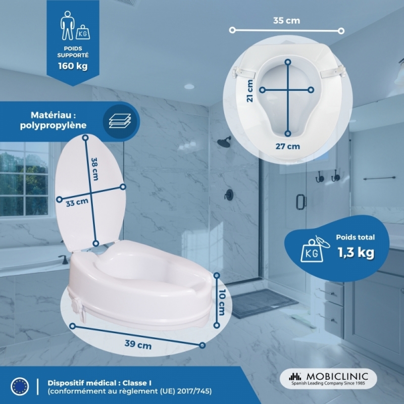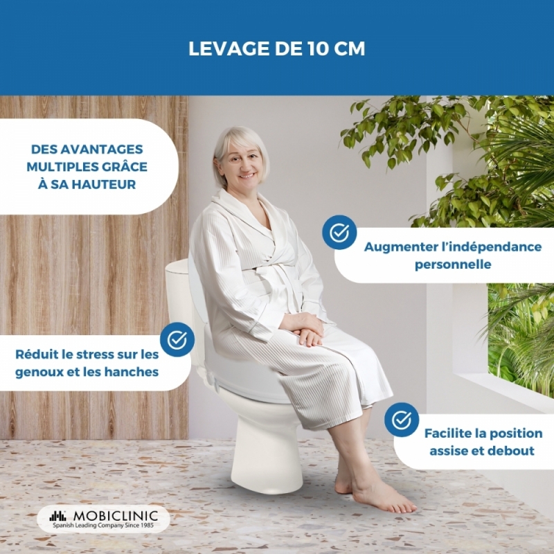 Cet élévateur de toilettes est idéal pour les personnes qui ont des difficultés à monter ou à se lever des toilettes. Avec son design ergonomique simple avec couvercle, il offre la discrétion et le confort dont vous avez besoin dans la salle de bain.