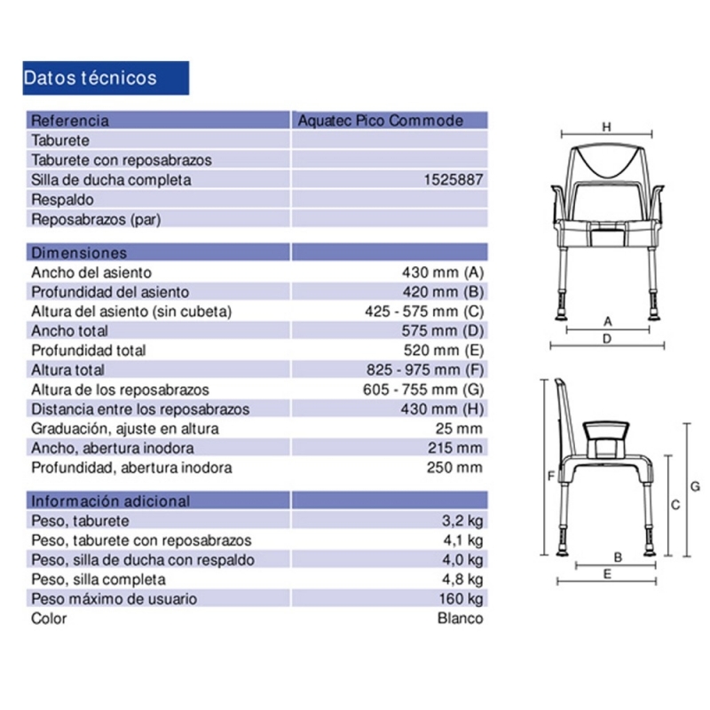 Ses accoudoirs amovibles permettent les transferts latéraux. Le seau est amovible par l'avant, par l'arrière ou par les côtés. La hauteur d'assise est réglable ce qui permet l'utilisation de la chaise percée au-dessus des toilettes, une fois le seau enlevé. Le dossier amovible permet l'utilisation de la chaise percée modulable Pico Commode dans la douche. Les pieds sont équipés de ventouses assurant ainsi une grande stabilité à la chaise percée.