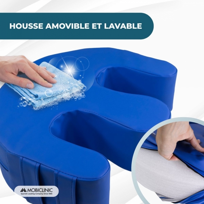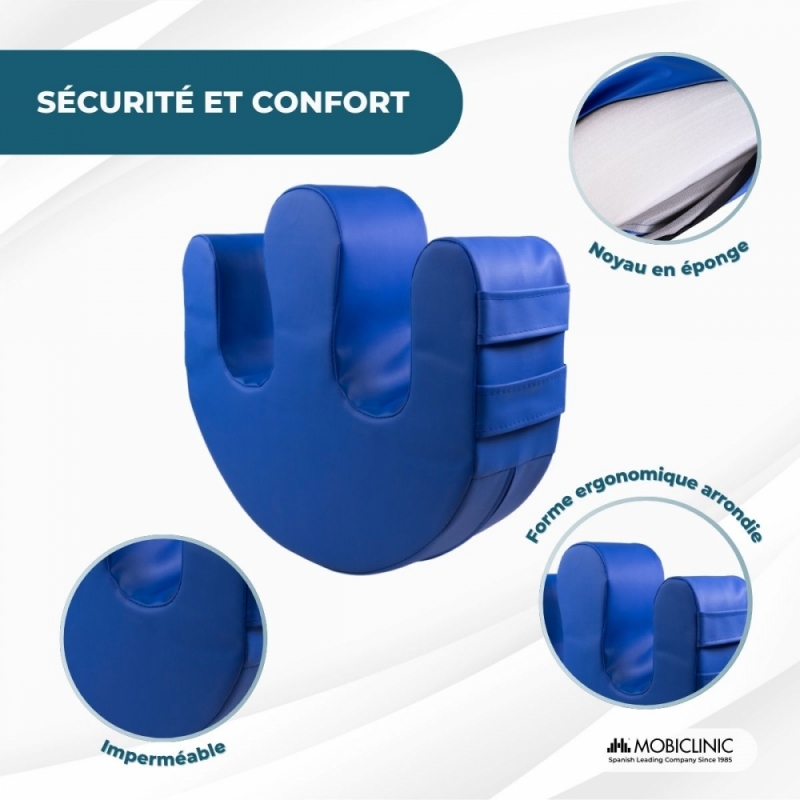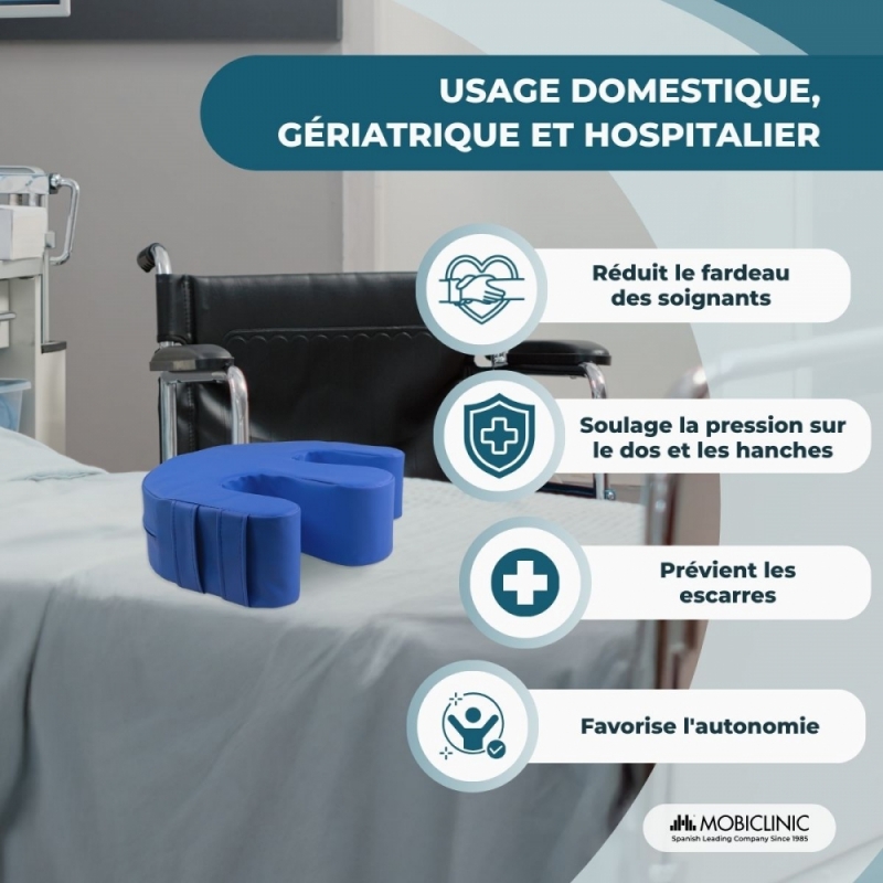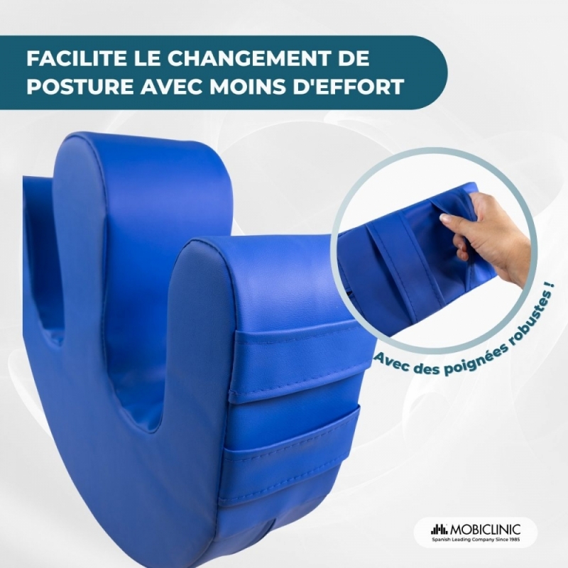 Le coussin de retournement Mobiclinic® Folk a été conçu pour améliorer la prise en charge des patients alités, facilitant les changements posturaux en tout confort et en toute sécurité. Sa forme en U, avec un séparateur de jambes arrondi et deux poignées latérales ergonomiques, permet au soignant de repositionner le patient sans effort, réduisant ainsi les efforts physiques et améliorant l'efficacité des soins quotidiens.