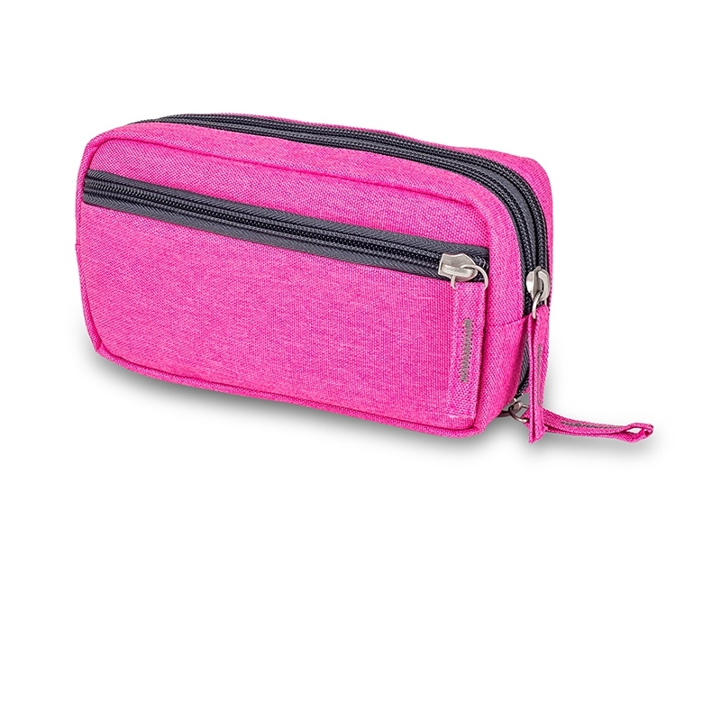 Trousse isotherme pour diabétique avec un design exclusif, moderne et élégant, en tissu rose de haute qualité, qui permet de transporter de manière optimale tous les accessoires nécessaires. Cette sacoche pour diabétique se compose de plusieurs compartiments tels qu'une poche filet, une poche velcro, un élastique pour les stylos, un élastique pour le lecteur de glucose, et une poche isotherme pour préserver le froid.