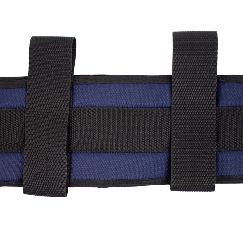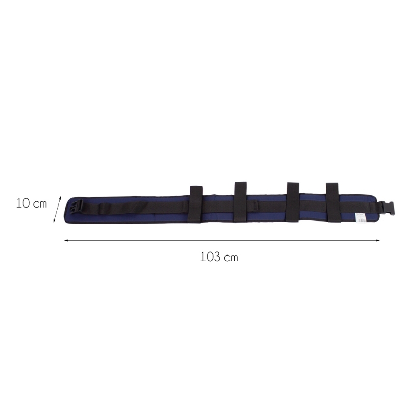 Ceinture conçue pour aider et faciliter les personnes à faible mobilité à se tenir debout, à s'asseoir ou à se déplacer d'un endroit à l'autre de manière facile, confortable, sûre et efficace, en évitant les blessures dues aux efforts excessifs des soignants. Elle s'attache autour de la taille et dispose de 4 poignées le long de la ceinture comme points d'attache avec des coutures renforcées.
