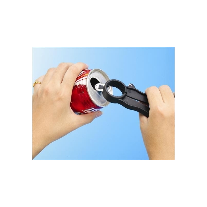 Ouvre-bouteille multi-usage noir en plastique. Sa forme lui permet d'ouvrir les canettes de boissons gazeuses, les bouchons à vis et autres récipients. Sa simplicité d'utilisation en fait l'accessoire de cuisine idéal pour les personnes ayant des problèmes dans les articulations supérieures.