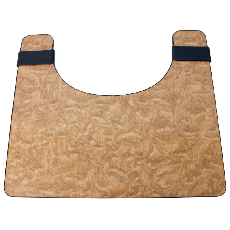 Ce plan de travail est fabriqué en aggloméré de 15 mm d'épaisseur de densité moyenne. Il s'adapte facilement à tous les types de fauteuils roulants grâce à ses sangles.