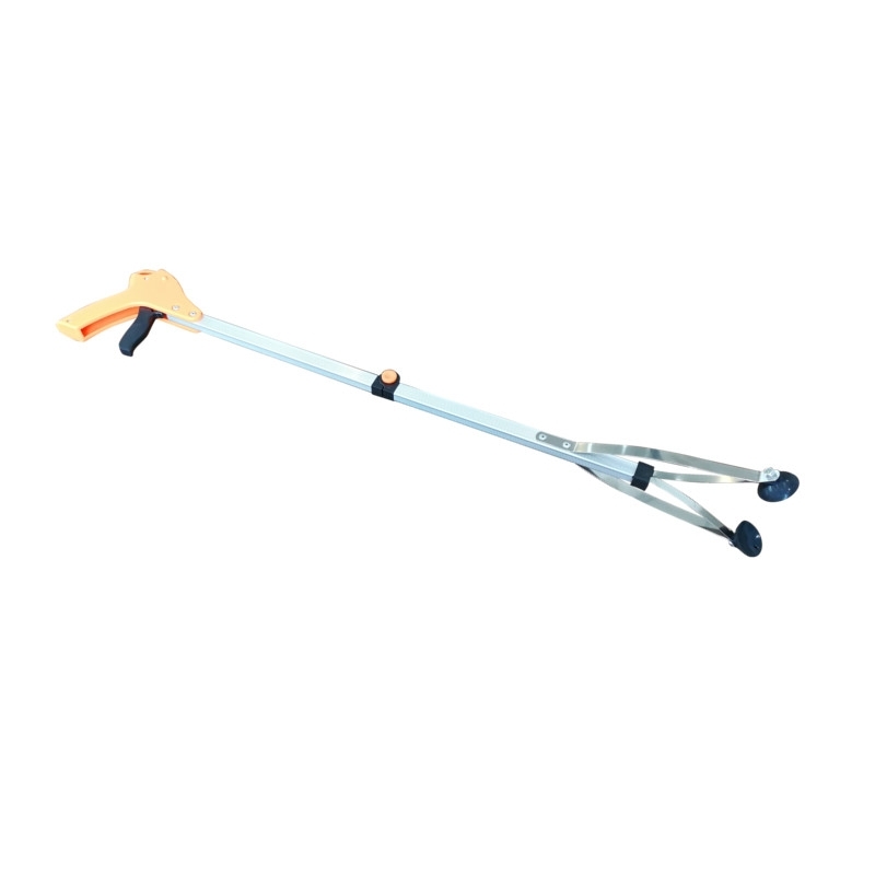 Pince pour ramasser en acier inoxydable avec poignée ergonomique. À l'aide de la manette, vous pouvez saisir des objets qui se trouvent à une distance d'environ 24 cm.