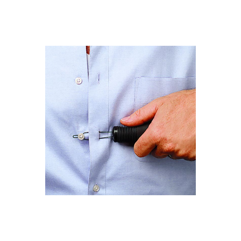 L'enfile bouton est composé d'un fil d'acier inoxydable et d'une poignée anatomique préparée pour une plus grande ergonomie de l'utilisateur. Pour l'utiliser, passez le fil à travers la boutonnière de votre vêtement et prenez le bouton en le déplaçant à l'intérieur de la boutonnière.