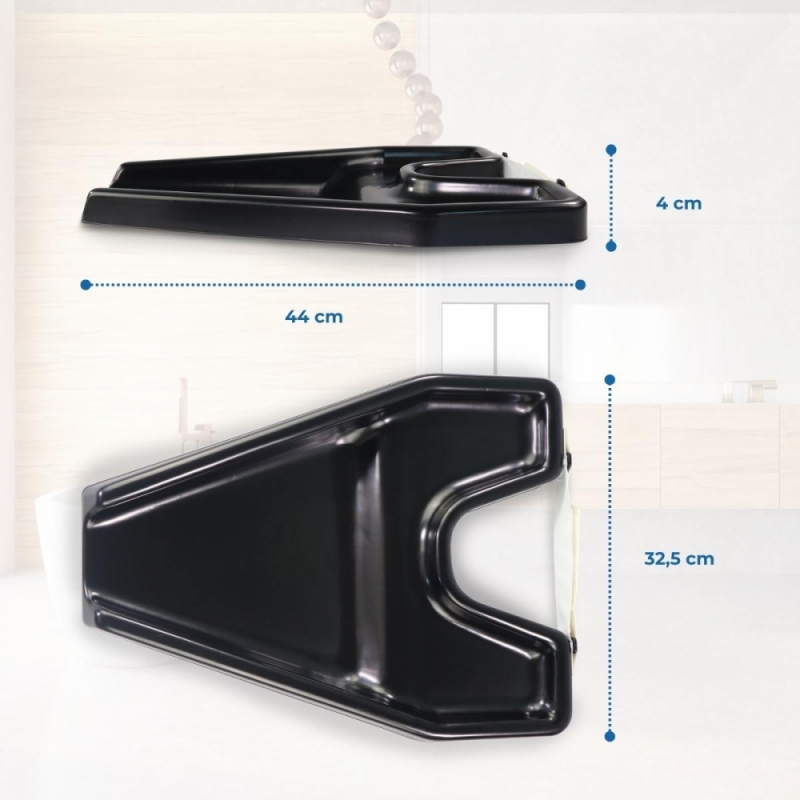 Avec le plateau lave-tête portable, les utilisateurs de fauteuil roulant ne seront plus obligés d’aller chez le coiffeur, puisque c’est un accessoire idéal pour une utilisation à la maison. Grâce à sa conception en forme de plateau en plastique et ses bords surélevés, il peut être fixé directement sur le lavabo. Cet accessoire de bain permet l'accès avec un fauteuil roulant et se fixe facilement au cou à l'aide d'une bande velcro.