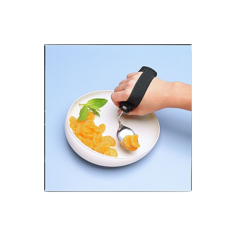 Cet adaptateur fabriqué en tissu doux est spécialement conçu pour les personnes ayant une prise en main limitée ou faible lorsqu'il s'agit d'ustensiles du quotidien tels que les couverts, les stylos, etc., car il intègre une bande velcro qui facilite la prise en main. Pour l'utiliser correctement, il suffit de placer la main sur l'ustensile et d'ajuster la bande velcro à la taille de la main du patient afin d'assurer une bonne prise pour éviter que les couverts ne tombent. L'adaptateur est disponible en une seule taille et convient aussi bien aux droitiers qu'aux gauchers.