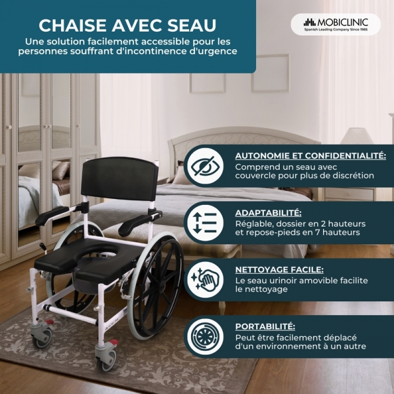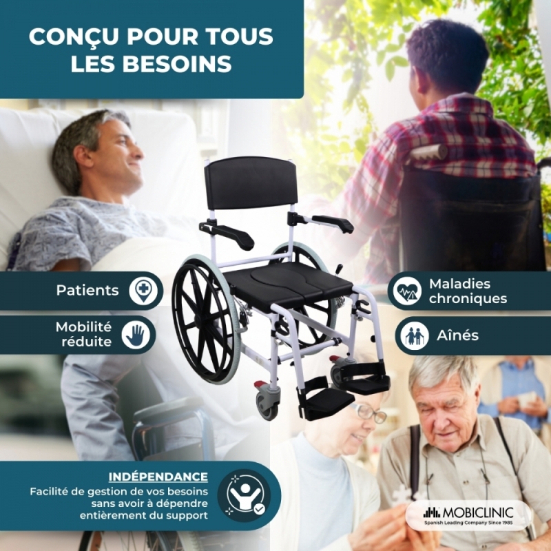 CHAISE MULTIFONCTION : Calígula est une chaise de salle de bain qui facilite le bain de ceux qui en ont besoin, en permettant de placer la chaise dans la douche. Mais c'est aussi une chaise de toilette qui possède un pot amovible, ce qui améliore le confort et la sécurité, et qui peut également être utilisée sur les toilettes (moins de 46 cm de haut et 45 cm de large). Enfin, il peut être utilisé comme chaise de transport pour faciliter les déplacements n'importe où.