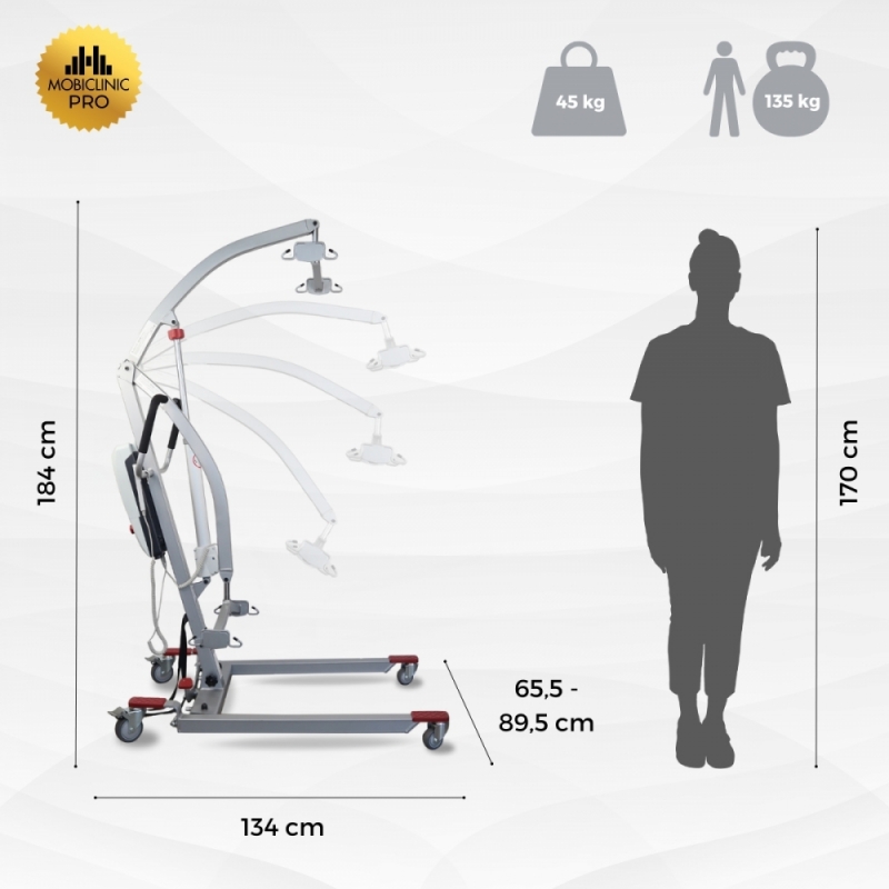 CAPACITÉ : Cette grue orthopédique supporte un poids maximum de 135 kg. Quant à sa distance d'élévation, elle est de 90 à 174 cm. De plus, son rayon de braquage est de 127 cm, tandis que le bras tourne d'environ 180º. Il peut descendre jusqu’à une hauteur d’environ 20 à 30 cm du sol.