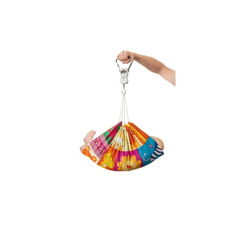 Balance électronique suspendue pour peser les bébés. Fabriquée en acier, elle se compose d'un crochet chromé pour pèse-bébés, d'une poignée pour tenir la balance et d'un grand écran LCD où s'affichent les résultats.