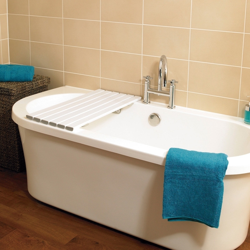 Tabla de bañera de material reforzado con orificios para el drenaje de agua diseñada para facilitar la tranferencia de pacientes a la bañera. Se coloca sencillamente sobre el borde del sanitario.