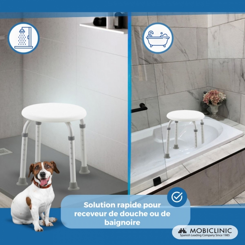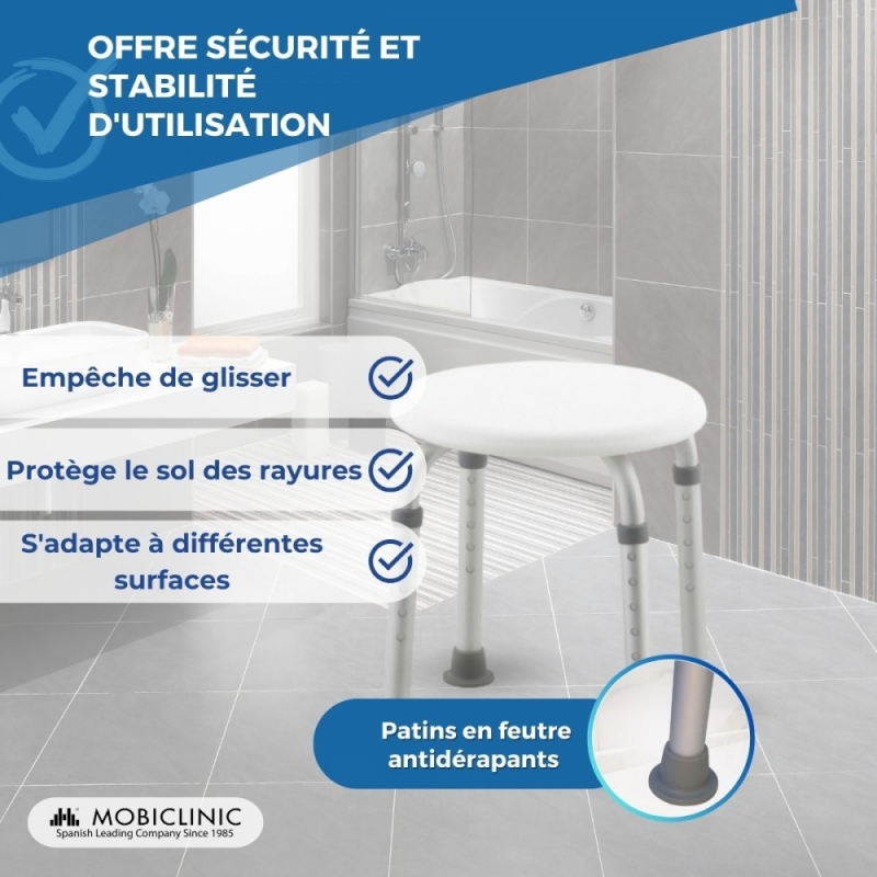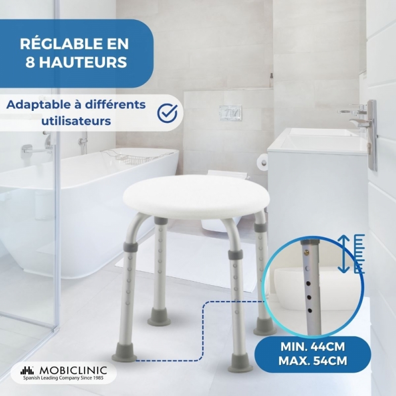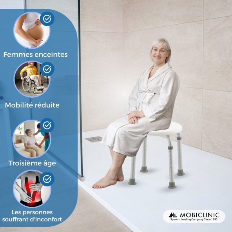 Ce tabouret de douche orthopédique est fabriquée en aluminium, ce qui le rend très léger et facilement transportable. Grâce à ses dimensions, il peut être utilisé aussi bien dans la salle de bains que dans la douche, ou dans la salle de bains elle-même. Il s'agit d'un élément pour une salle de bains adaptée aux besoins des personnes âgées ou handicapées.