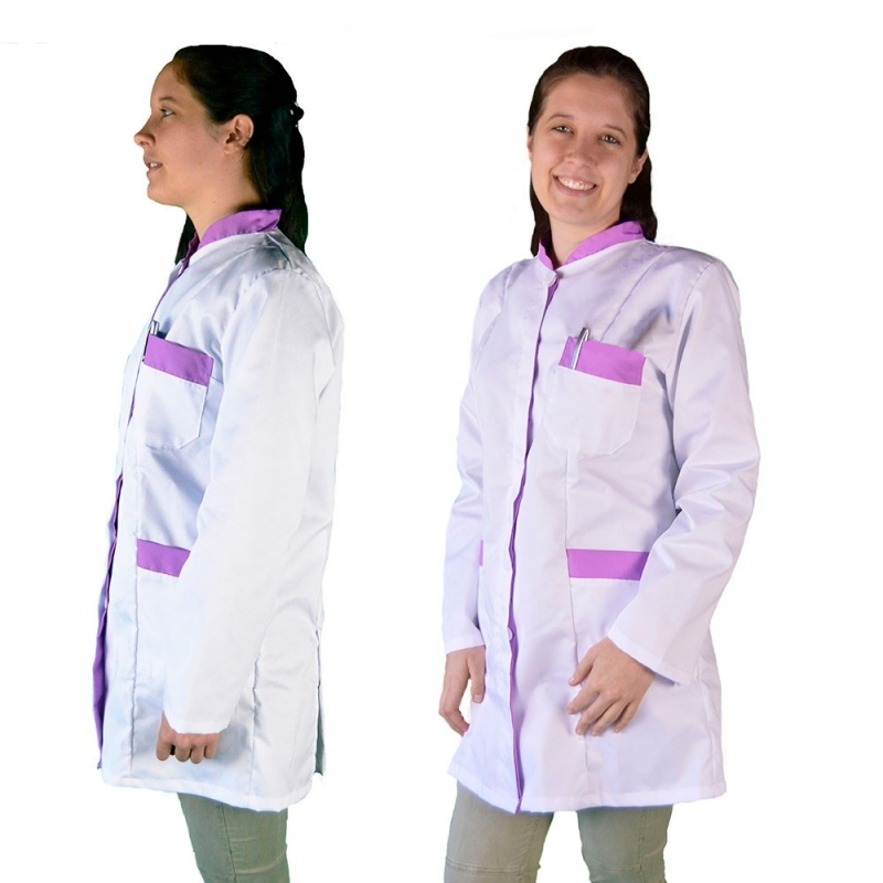 CARACTÉRISTIQUES : c'est une blouse médicale avec des liserés violets sur le col et les poches. La couleur blanche apporte de la sérénité et ses motifs violets en font une blouse moderne pour les professionnels dynamiques à la fois. Il se ferme avec des boutons.
