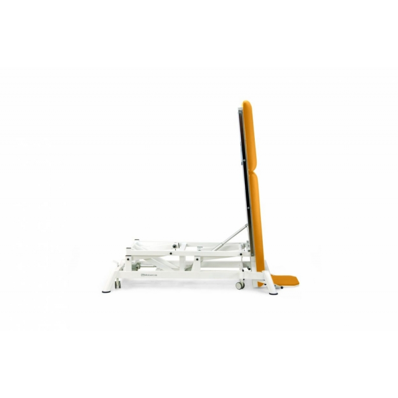 Brancard plan debout/incliné pour pédiatrie à 2 sections avec réglage motorisé de la hauteur et de la hauteur, repose-pieds indépendants et réglables (inclinaison/déclinaison), dossier réglable, guides latéraux pour l'ancrage des sangles de fixation et divers accessoires et roues escamotables.