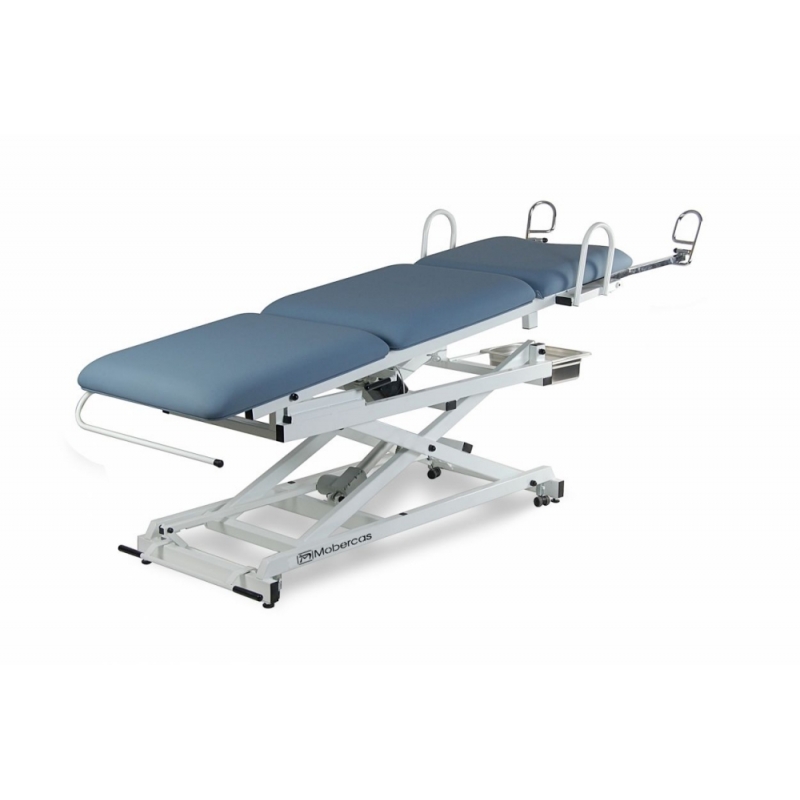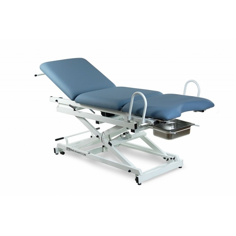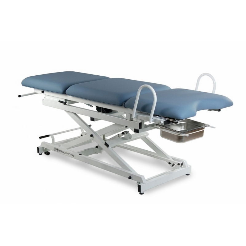 Table d'examen gynécologique électrique avec 3 moteurs pour le réglage de la hauteur, du dossier et du Trendelenburg par commande manuelle. Structure en ciseaux à élévation droite sans déplacement latéral.