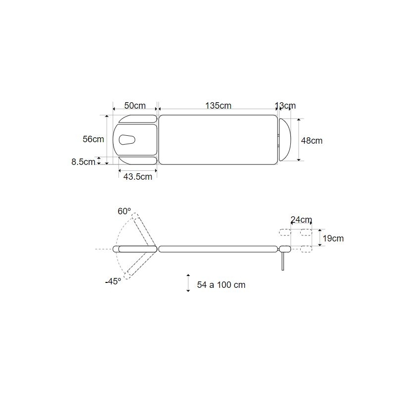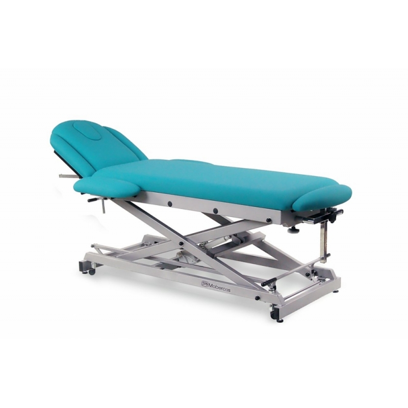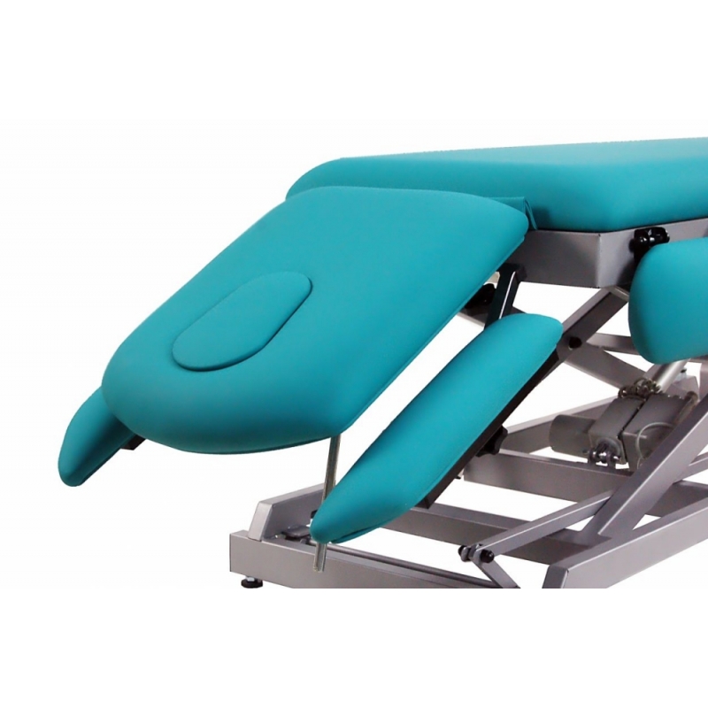 Table de traitement électrique multifonctionnelle pour l'ostéopathie à 7 sections avec élévation droite sans déplacement latéral, capuchon facial et roues escamotables. Dossier inclinable négatif avec accoudoirs, accoudoirs latéraux et repose-pieds réglables et amovibles.