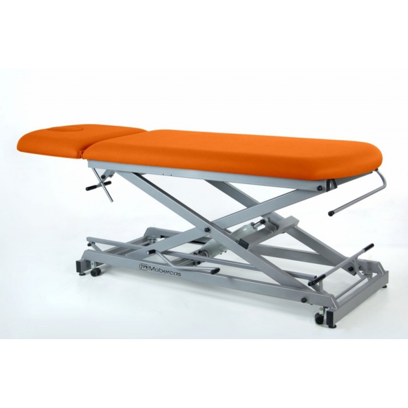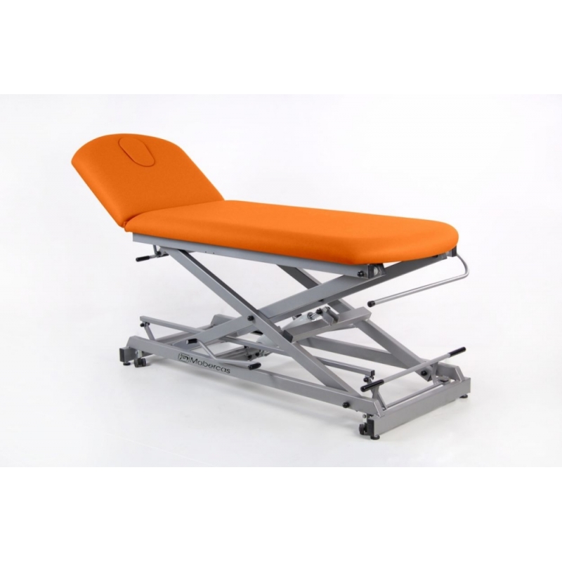 Divan d'examen hydraulique à 2 sections avec dossier négatif inclinable et montée droite sans mouvement latéral, porte-rouleau, coiffe faciale et roues escamotables.