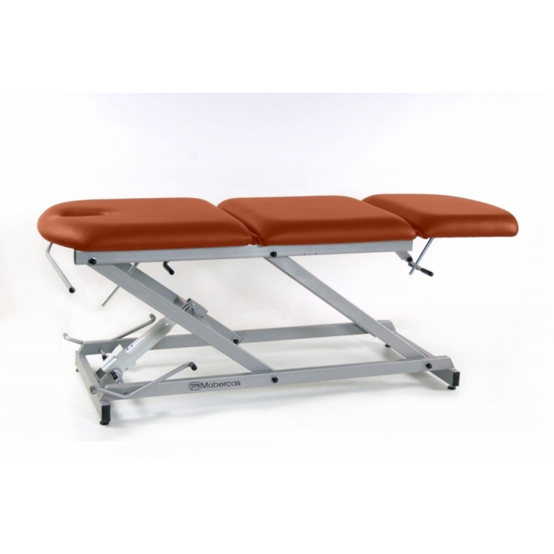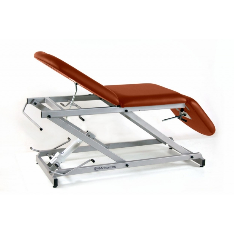 Civière hydraulique de type fauteuil à 3 sections avec porte-rouleau et capuchon facial.