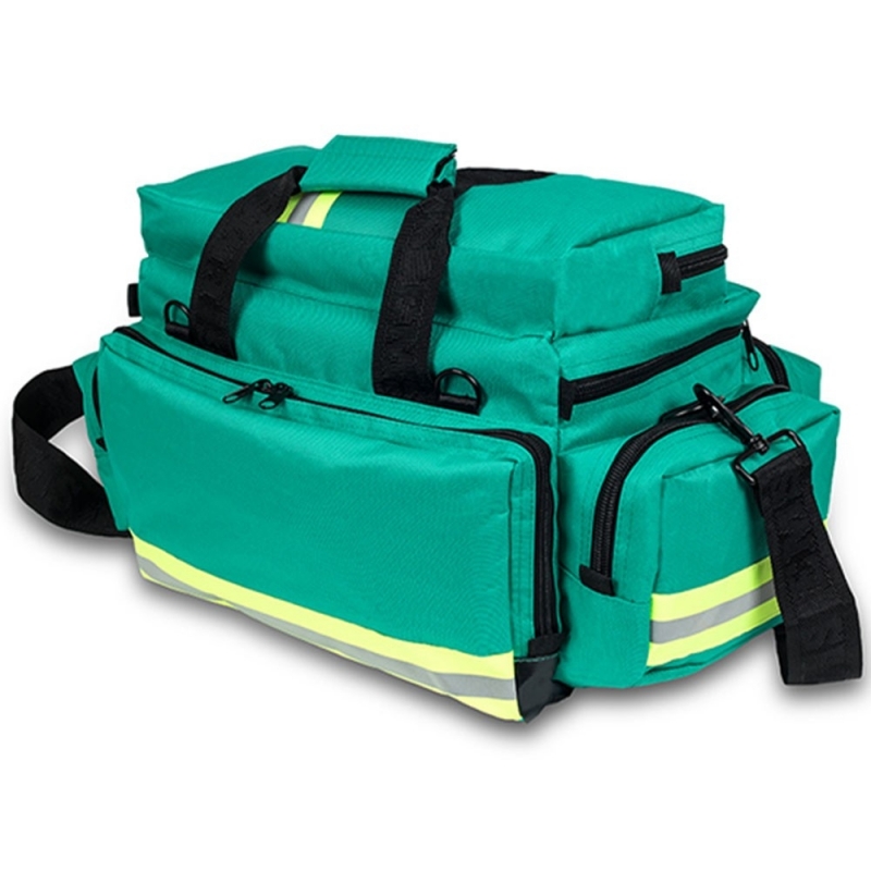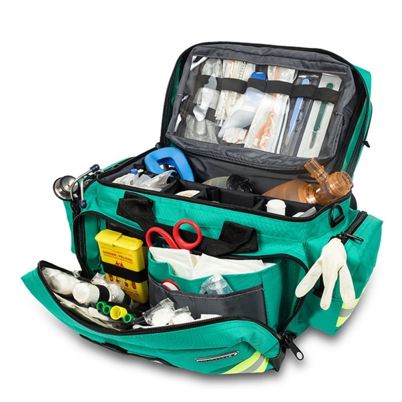 Sac d'urgence pour les soins de base en réanimation, de grande capacité et rembourré, conçu pour contenir les équipements médicaux les plus délicats. A l'intérieur, il est subdivisé en 4 compartiments de moyenne capacité et un compartiment allongé de grande capacité. Le sac médical d'urgence dispose d'une poche transparente située sur le rabat intérieur, conçue pour être vue et fermée facilement, grâce aux élastiques dont elle est dotée. En outre, le sac à dos d'urgence de grande capacité est doté de cinq poches extérieures, une à l'arrière et une en haut, ouvertes, et d'une poche avant subdivisée à l'intérieur par des poches et des élastiques. La base de ce sac d'urgence est faite de bâche, un tissu imperméable qui évitera les taches éventuelles en cas de déversement de liquides.