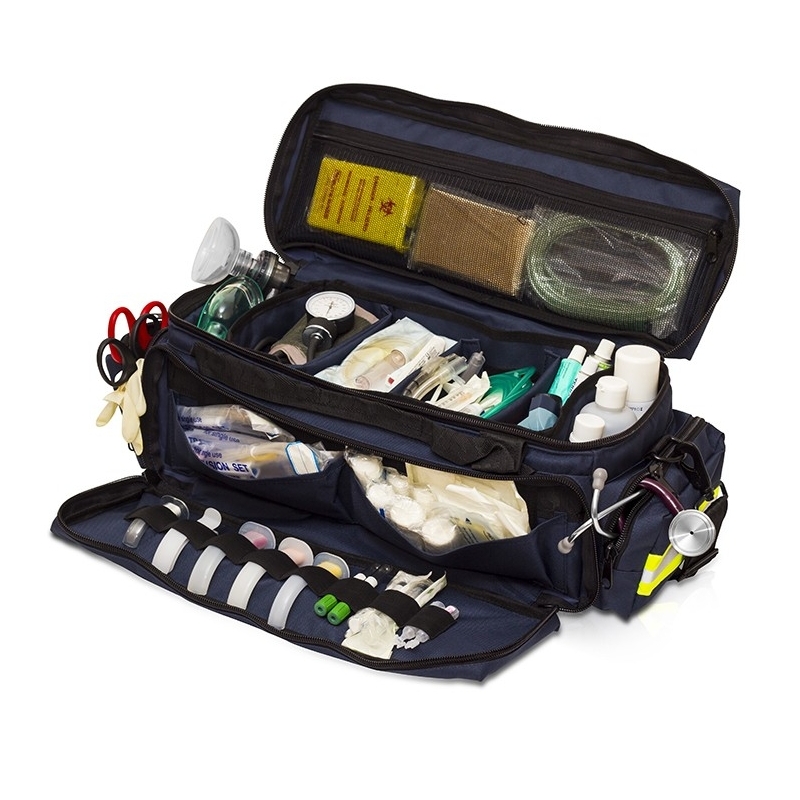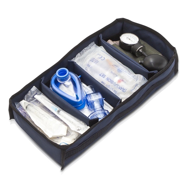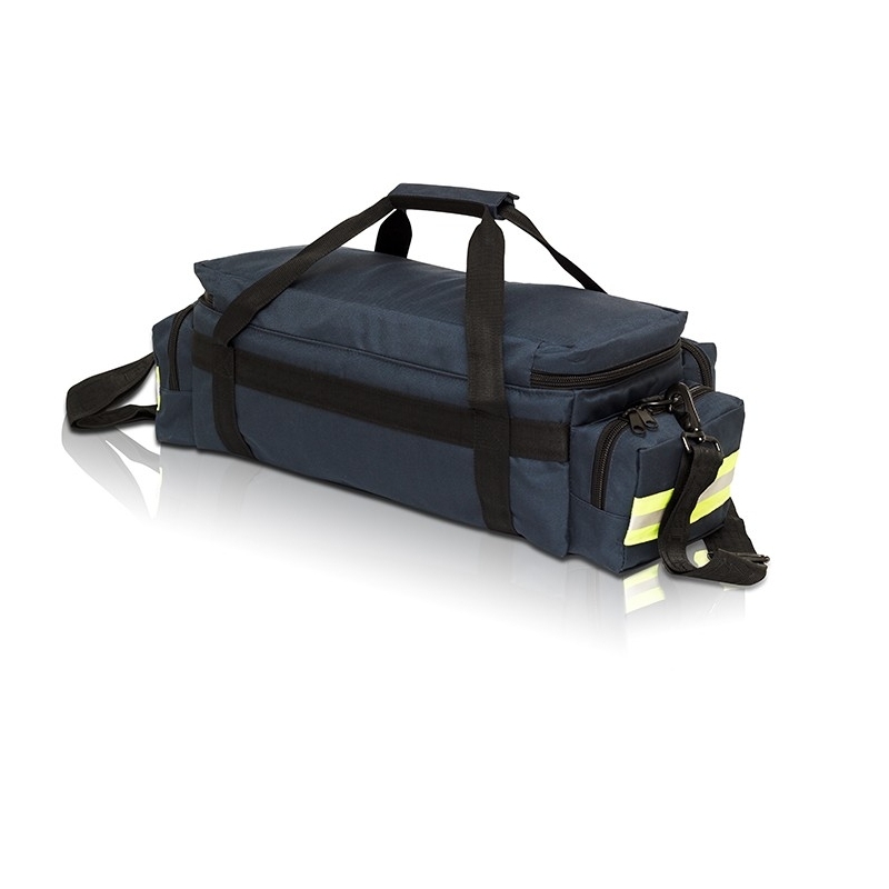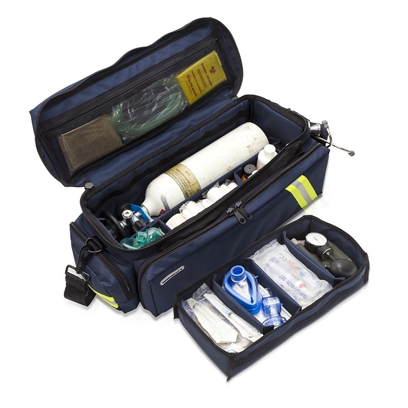 Sac d'urgence rembourré conçu pour accueillir le matériel sanitaire lié à l'oxigénothérapie, subdivisé à l'intérieur en deux hauteurs :