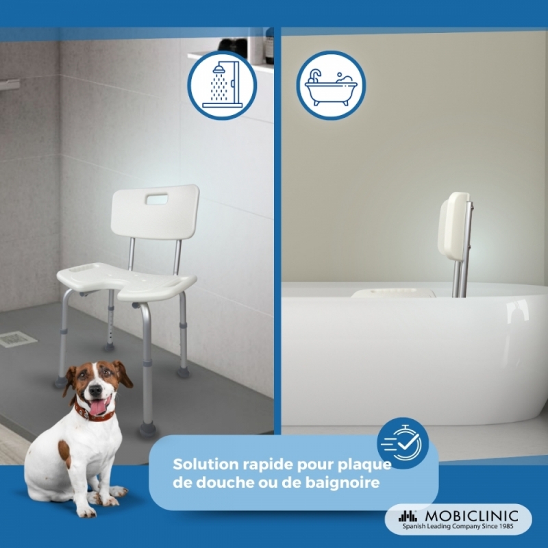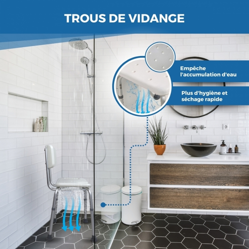 Il est idéal pour une utilisation dans votre douche, votre baignoire ou toute autre salle de bains. La conception de ses pieds et les embouts en caoutchouc antidérapants lui permettent de s'adapter parfaitement à la surface de support, garantissant ainsi la stabilité pendant l'utilisation.