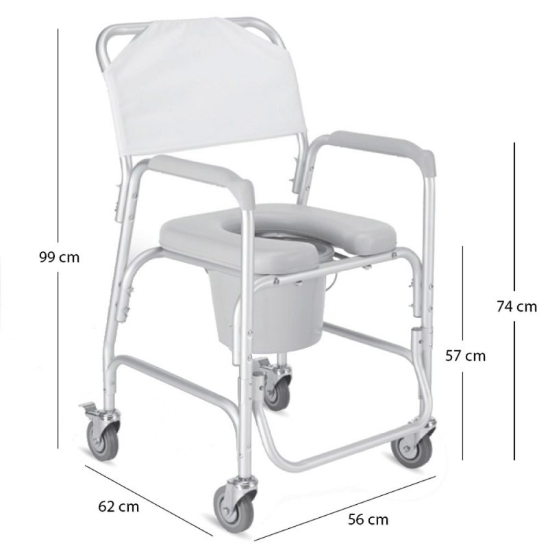 La chaise de bain à roulettes avec WC/chaise percée pour douche est un fauteuil roulant qui facilite le transport de la personne sous la douche. En outre, elle dispose d'un trou pour servir de toilettes. Elle est munie d'accoudoirs, d'un dossier et d'un siège rembourré en forme de U, ce qui augmente le confort et l’hygiène.