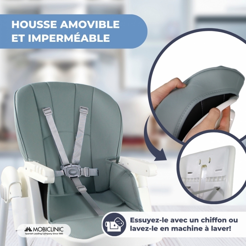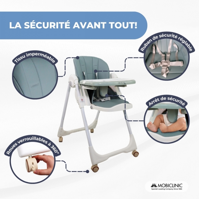 Ce modèle entièrement pliable et polyvalent est peu encombrant et doté de roues avec frein pour un transport plus aisé et plus confortable. Grâce à sa conception, il offre une multitude de possibilités en tant que siège, pour que l'enfant puisse progressivement rejoindre la table et apprendre à utiliser les couverts, par exemple.