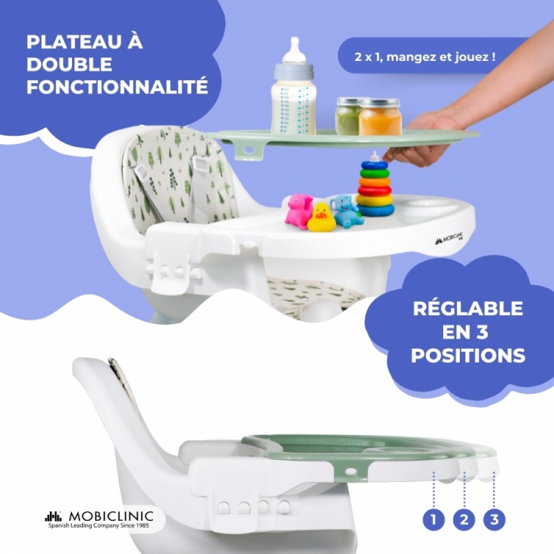 AVEC PLATEAU RÉGLABLE SUR 3 NIVEAUX : De cette façon, la chaise haute Forest est très pratique puisqu'elle offre de l'espace pour les mouvements du petit en fonction de l'activité qu'il pratique. Le plateau est amovible et double.