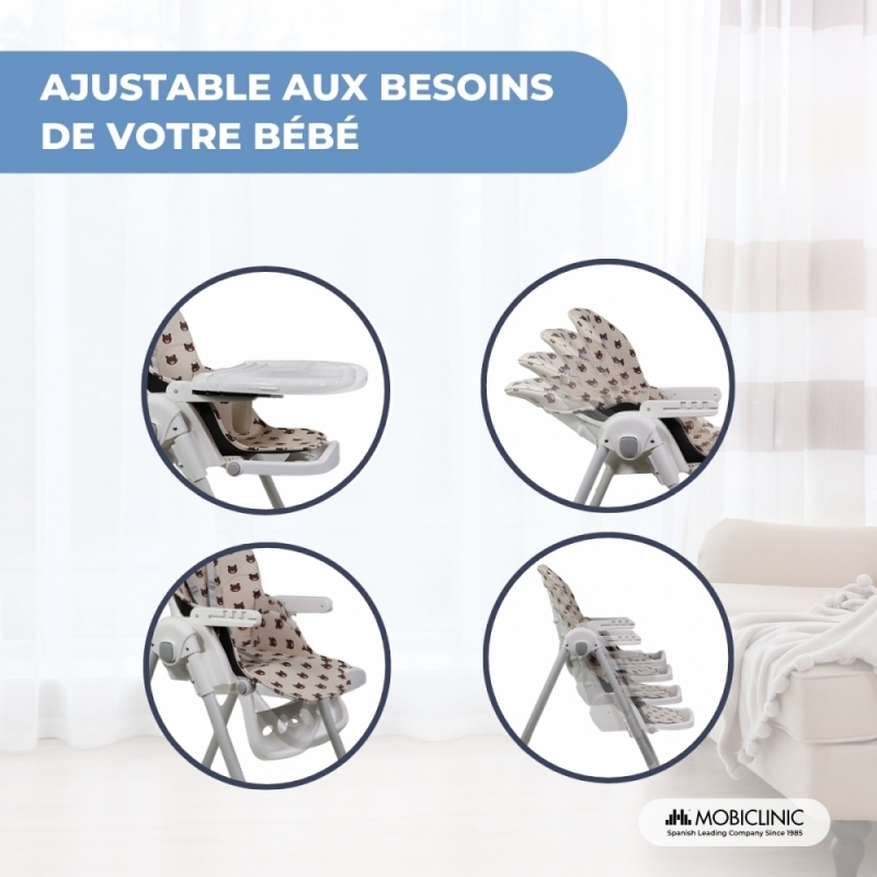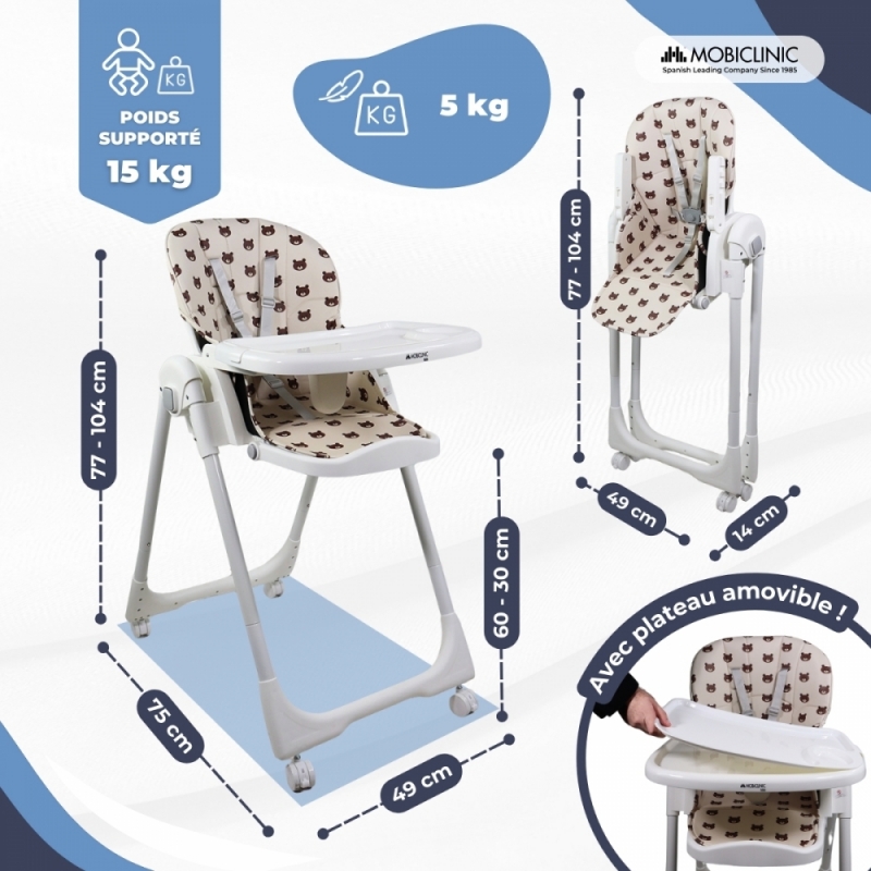 Ce modèle entièrement pliable et polyvalent prend peu de place et dispose de roues avec freins pour un transport meilleur et plus confortable. Il offre une multitude de possibilités comme siège grâce à son design, pour que l'enfant rejoigne progressivement la table et apprenne à utiliser les couverts par exemple.