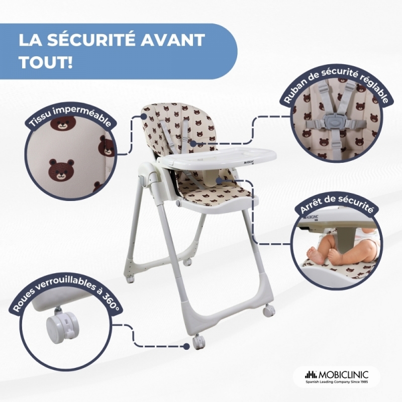 Un autre point important est la sécurité : la chaise haute est équipée d'un harnais à 5 points, qui offre un soutien supplémentaire au bébé et une plus grande tranquillité d'esprit aux parents. Sa plage d'utilisation est conçue pour les enfants entre 6 et 36 mois ou jusqu'à 15 kg.