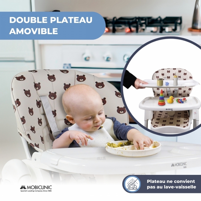 Ses matériaux sont conçus pour une hygiène rapide et efficace en cas de taches aussi bien solides que liquides. Ainsi, son double plateau permet de garantir que les restes alimentaires ne restent pas incrustés et peuvent être lavés directement avec un chiffon humide.