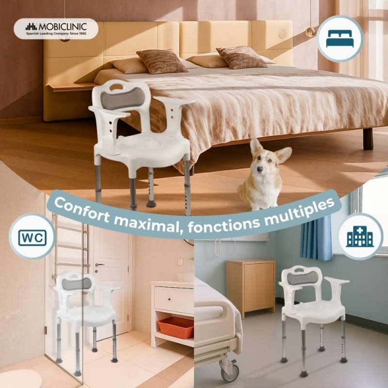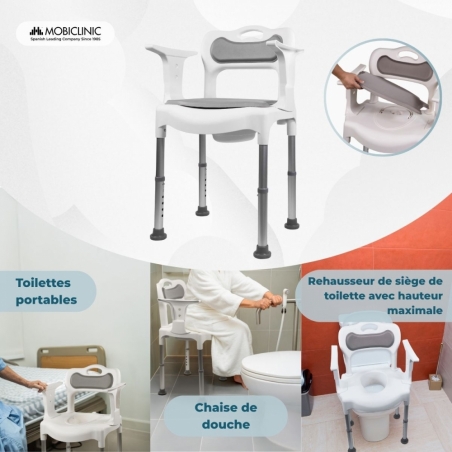 CONFORT MAXIMAL : La chaise de bain Guido est dotée de coussins d'assise et de dossier, offrant un confort supérieur à celui des autres modèles. De plus, grâce à sa conception, elle peut être utilisée comme chaise de bain, toilettes portables ou chaise de douche.