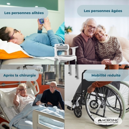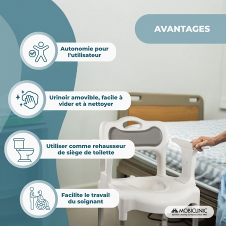 URINOIR INCLUS : Cette chaise est équipée d'un urinoir amovible pouvant supporter jusqu'à 6 kg et d'une capacité allant jusqu'à 3 500 ml, offrant une grande autonomie à l'utilisateur. Le retrait de l'urinoir est très simple, ce qui facilite le nettoyage et garantit une utilisation toujours hygiénique.