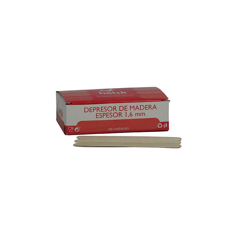 Abaisse-langue en bois aux bords arrondis et parfaitement poli pour éviter les frottements. Boîte en carton ondulé. Chaque boîte contient 100 dépresseurs.