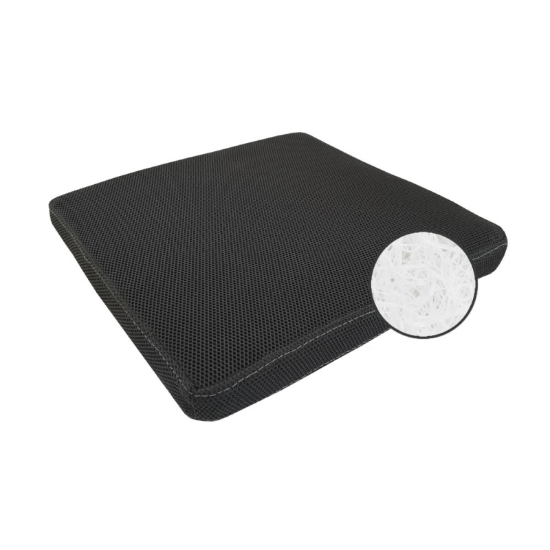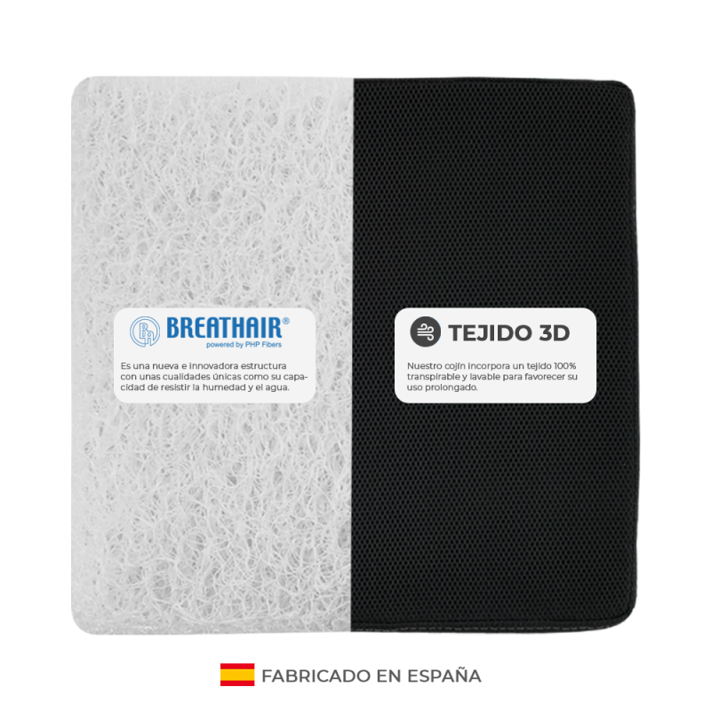 Coussin anti-escarres de 5 ou 9 cm d'épaisseur en Breathair. Breathair est une structure nouvelle et innovante qui présente des qualités uniques telles que sa capacité à résister à l'humidité et à l'eau. Sa composition est constituée à 90% d'air, ce qui le rend extrêmement respirant et empêche la condensation.