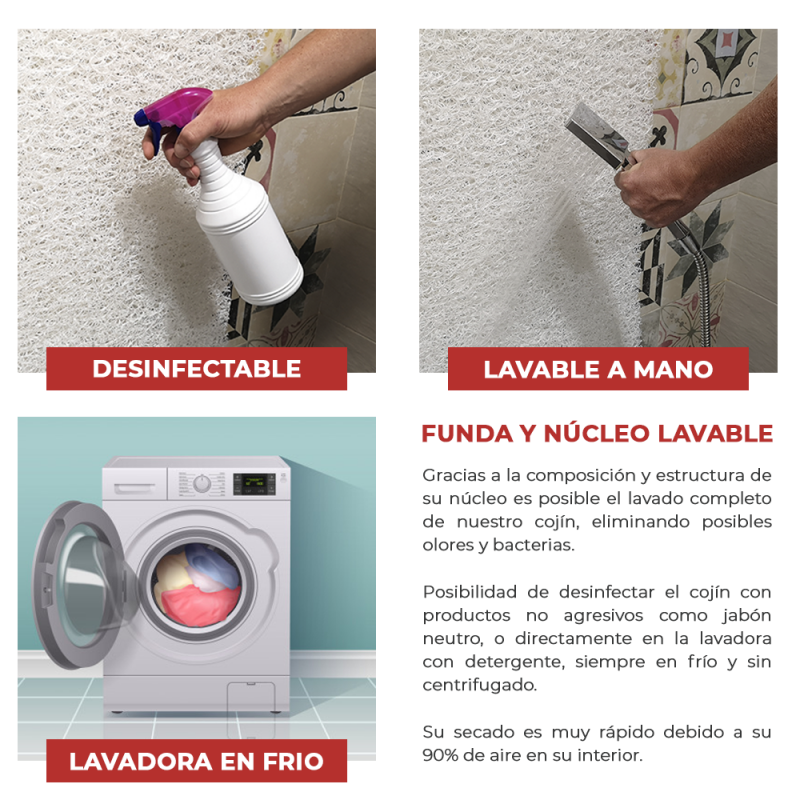 HYGIÉNIQUE : L'une des qualités les plus importantes de notre coussin anti-escarres est son hygiène. Contrairement à un coussin classique dont seule sa housse est lavable, le coussin anti-escarres possède un noyau imperméable avec lequel on a la possibilité de le laver en machine sans le retirer.