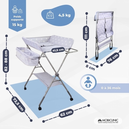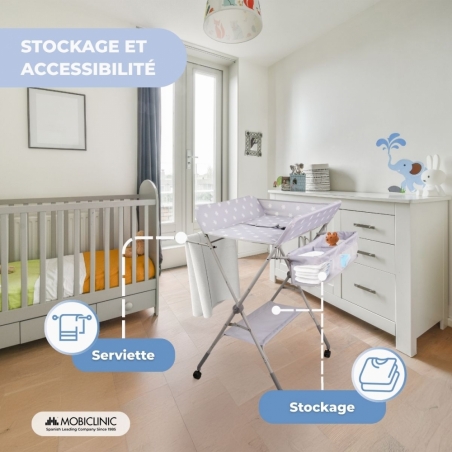 FONCTIONNELLE ET PLIABLE : Cette table à langer est dotée d'un panier latéral de grande capacité, d'une barre porte-serviettes et d'une étagère inférieure offrant davantage d'espace pour ranger tous les produits d'hygiène de bébé. Elle se plie facilement pour un encombrement minimal et sa housse est amovible pour un nettoyage optimal et efficace.