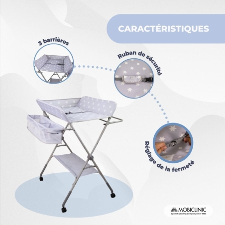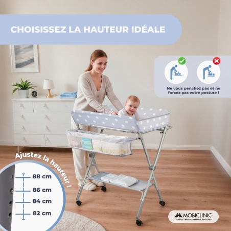 L'un de ses principaux atouts est sa hauteur réglable sur cinq niveaux : 82, 84, 86, 88 et 90 cm, s'adaptant ainsi à la taille et aux besoins de chaque utilisateur et garantissant une posture confortable, avec moins d'efforts et d'inconfort. De plus, ses quatre roulettes pivotantes à 360° facilitent le déplacement de la table à langer, tandis que ses freins offrent une stabilité et une sécurité accrues.