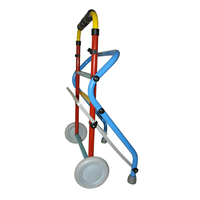 Déambulateur très léger et coloré, spécialement conçu pour les enfants. Il est fabriqué en aluminium et en thermoplastique, il est pliable et les poignées sont réglables en hauteur.