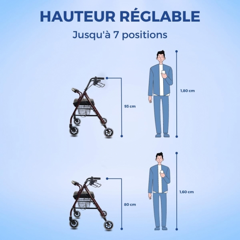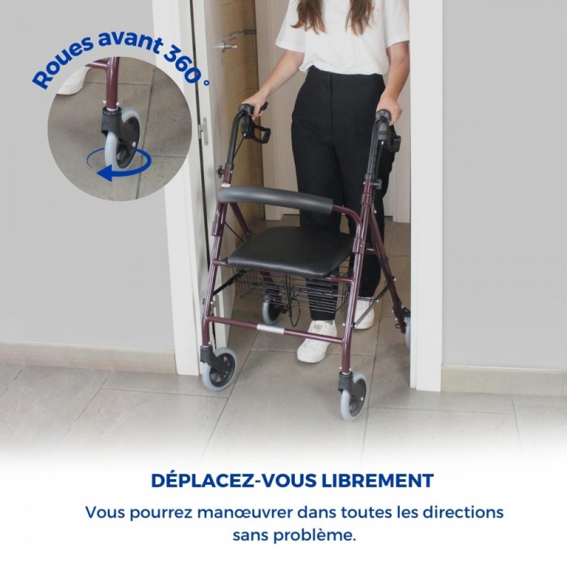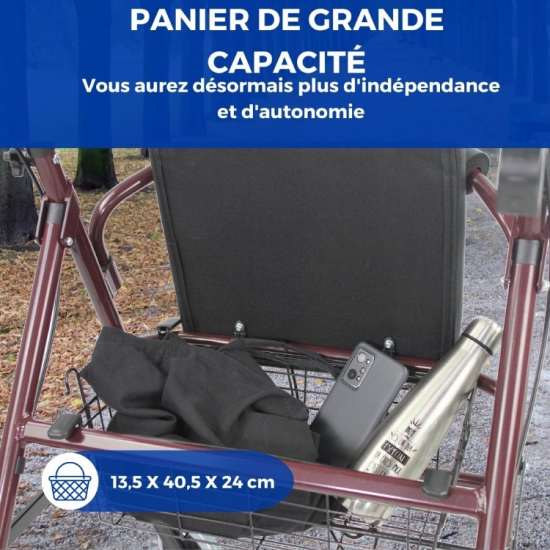 Ce déambulateur en aluminium est doté d'un siège et d'un dossier rembourrés pour assurer le confort et la sécurité, ainsi qu'un repos adéquat après l'effort. Il comprend un panier conçu pour ranger vos affaires en toute sécurité et confortablement pendant que vous marchez. Il peut être positionné soit sous le siège, soit à l'avant du déambulateur.