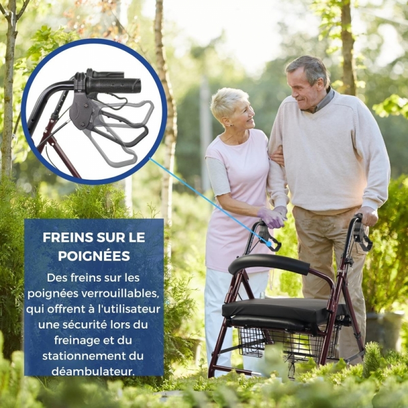 SR : le déambulateur est doté de freins à main et de poignées ergonomiques qui s'adaptent, aidant à répartir et à amortir le poids lors de la marche, permettant une meilleure maniabilité du déambulateur. De même, le coussin s'ajuste à l'assise grâce à 4 attaches velcro qui sont fixées au tube du déambulateur , pour une adhérence totale.