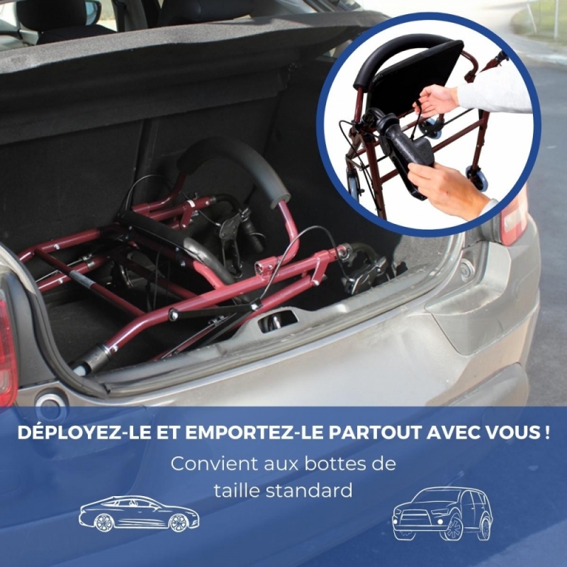 PORTES ET COFFRE : Ce déambulateur a une largeur totale de 60 cm, il peut donc passer par des portes standard de 62,5 cm de large. De plus, comme ce déambulateur plié ne mesure que 24,5 cm, il est assez facile à transporter. Assurez-vous des mesures de vos portes et de votre véhicule pour vérifier qu'il vous convient.
