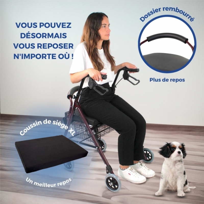 Cet incroyable pack comprend le déambulateur Escorial en bordeaux et un coussin anti-escarres spécialement conçu pour les déambulateurs.