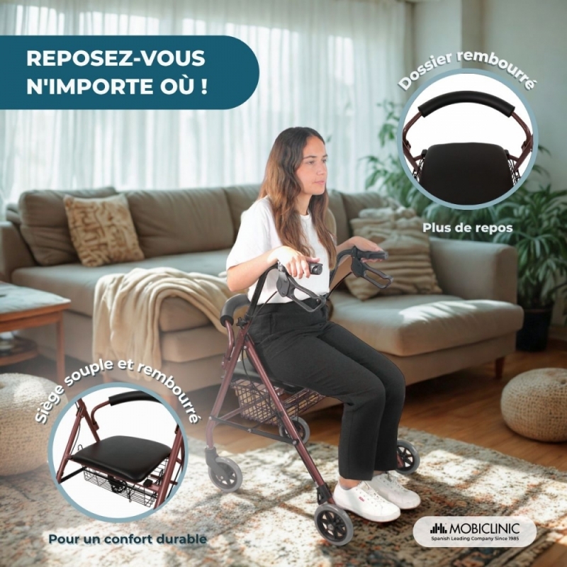 Ce déambulateur en aluminium est doté d'un siège et d'un dossier rembourrés pour assurer confort et sécurité, ainsi qu'un repos adéquat après l'effort. Comprend un panier conçu pour ranger vos affaires en toute sécurité et confortablement pendant que vous marchez. Vous pouvez le positionner aussi bien sous le siège qu'à l'avant du déambulateur .