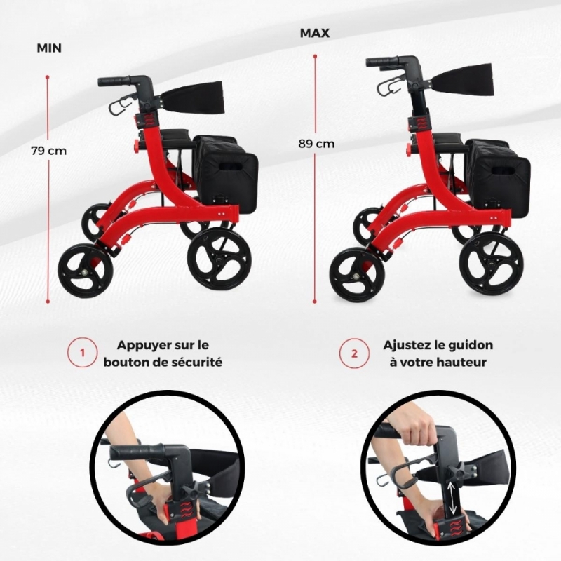 Quant au système de freinage, il est vraiment simple et utile pour garantir la sécurité de l'utilisateur et éviter d'éventuelles chutes. Pour verrouiller complètement le déambulateur, les deux leviers de frein doivent être enfoncés vers le bas, tandis que pour freiner en mouvement, les leviers de frein doivent être enfoncés vers le haut. De plus, sa hauteur est réglable de 10 cm grâce au guidon pour le confort de chacun.