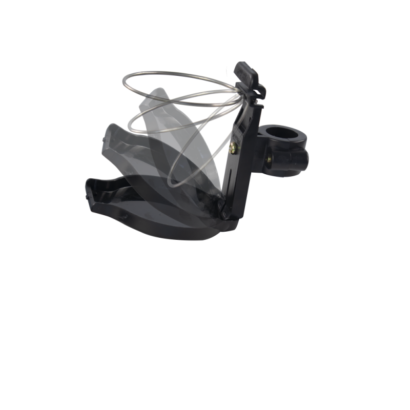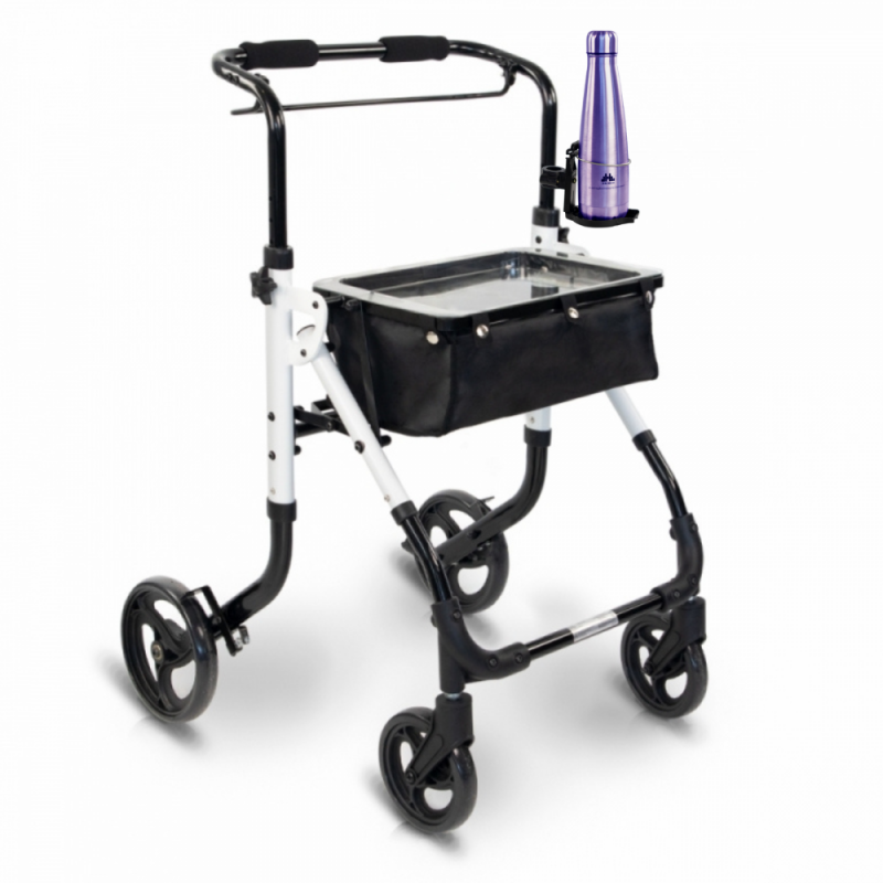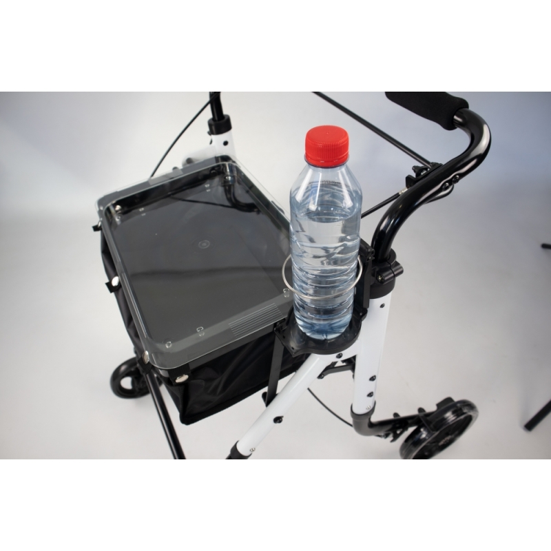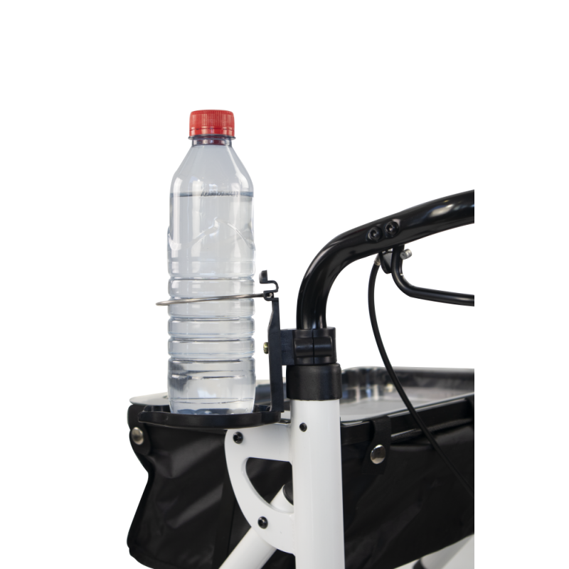 - Support pour bouteilles ou verres : cet outil vous permet de transporter toutes sortes de boissons en toute sécurité grâce à sa simplicité d'installation. Pour générer une plus grande stabilité, il dispose d'un plateau en bas et d'un anneau de serrage en haut. Il est conçu pour maintenir fermement et en toute sécurité tout type de gobelet ou de bouteille, s'adaptant facilement à la structure du déambulateur et avec la possibilité de se plier lorsqu'il n'est pas utilisé.