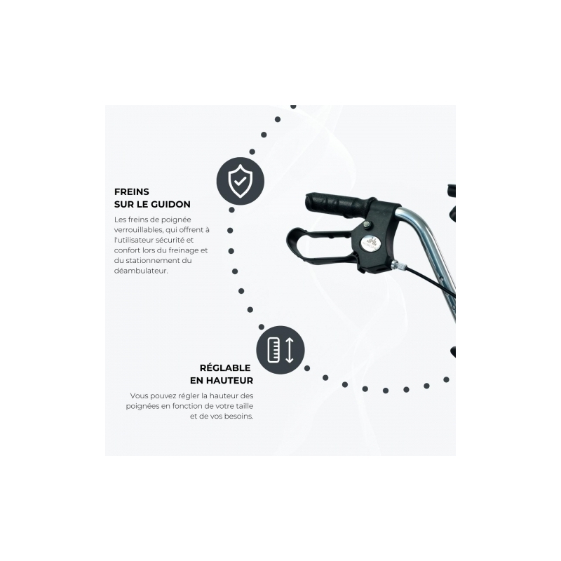 Sa poignée ergonomique qui réduit la fatigue lors de l'utilisation comprend des freins à activation douce pour arrêter le déambulateur pour personnes âgées juste au moment souhaité et sans effort. Vous avez également la possibilité de laisser les freins bloqués pour garantir l'immobilisation du déambulateur en position assise ou penchée.