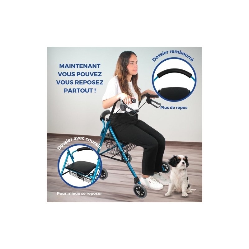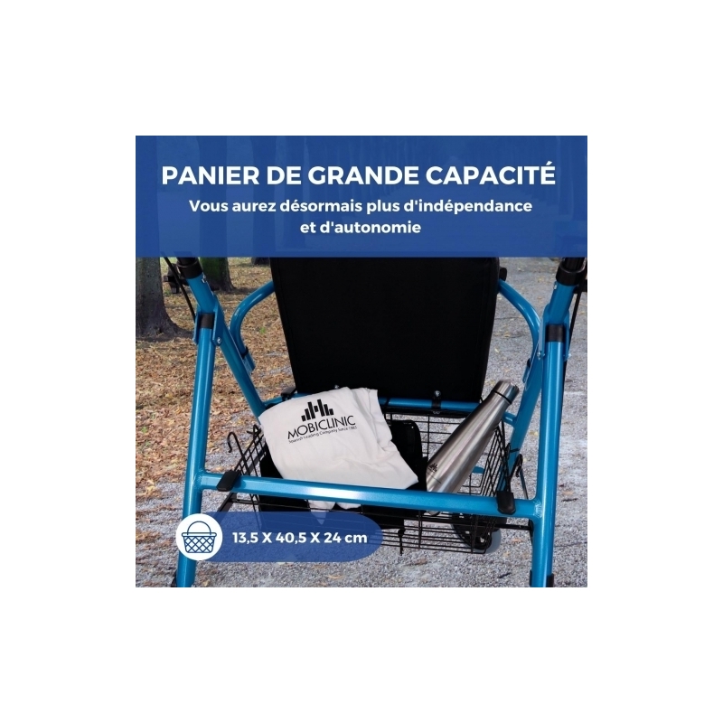 Ce déambulateur en aluminium possède une assise et un dossier rembourrés pour assurer confort et sécurité, ainsi qu'un repos adéquat après l'effort. Il comprend un panier conçu pour ranger vos affaires en toute sécurité et confortablement pendant que vous marchez. Vous pouvez le placer à la fois sous le siège et à l'avant du déambulateur.