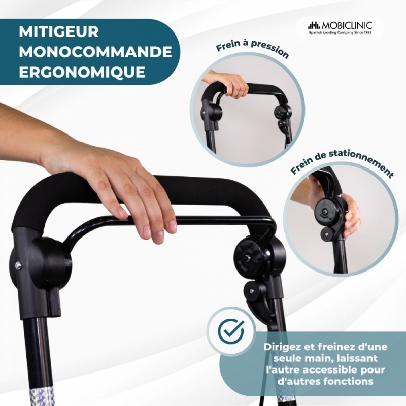 MONO-LEVIER : Le chariot de courses Coliseo est mono-levier, permettant à l'utilisateur de l'utiliser d'une seule main tout en promenant par exemple son petit-enfant ou son chien.